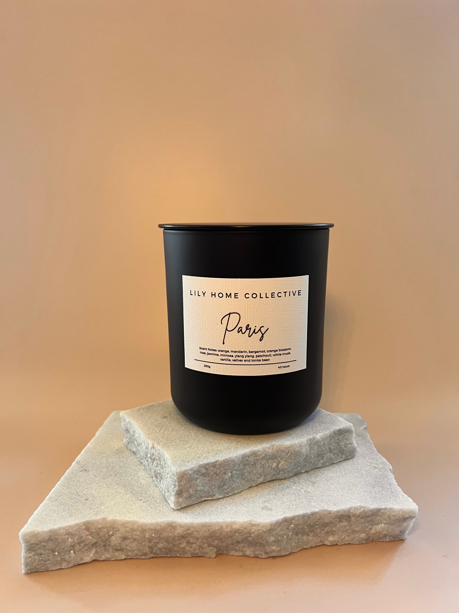 A fragrance as timeless and romantic as the city itself. Bright mandarin and bergamot open with sparkling freshness, giving way to a floral heart of rose, jasmine, and mimosa. The scent deepens into a sensual base of patchouli, musk, and vanilla, creating a perfect balance of elegance, warmth, and allure. A candle made for moments that feel unforgettable.