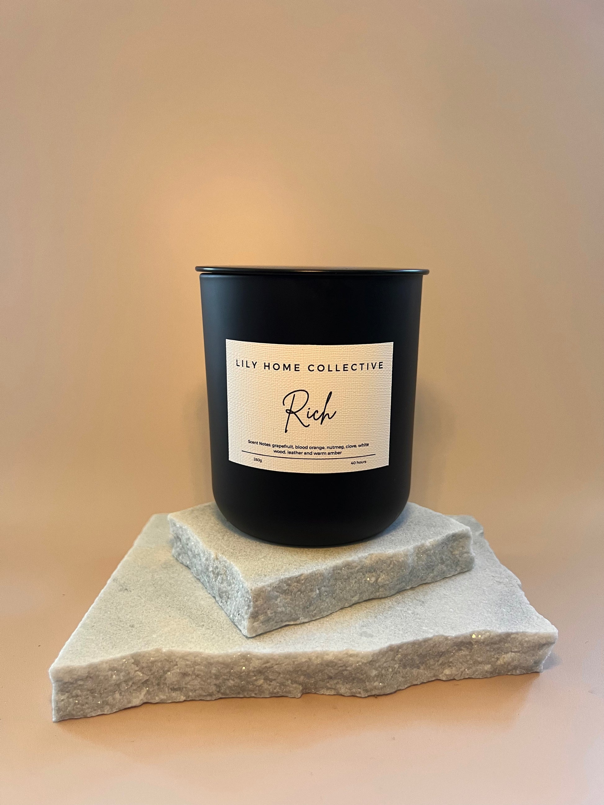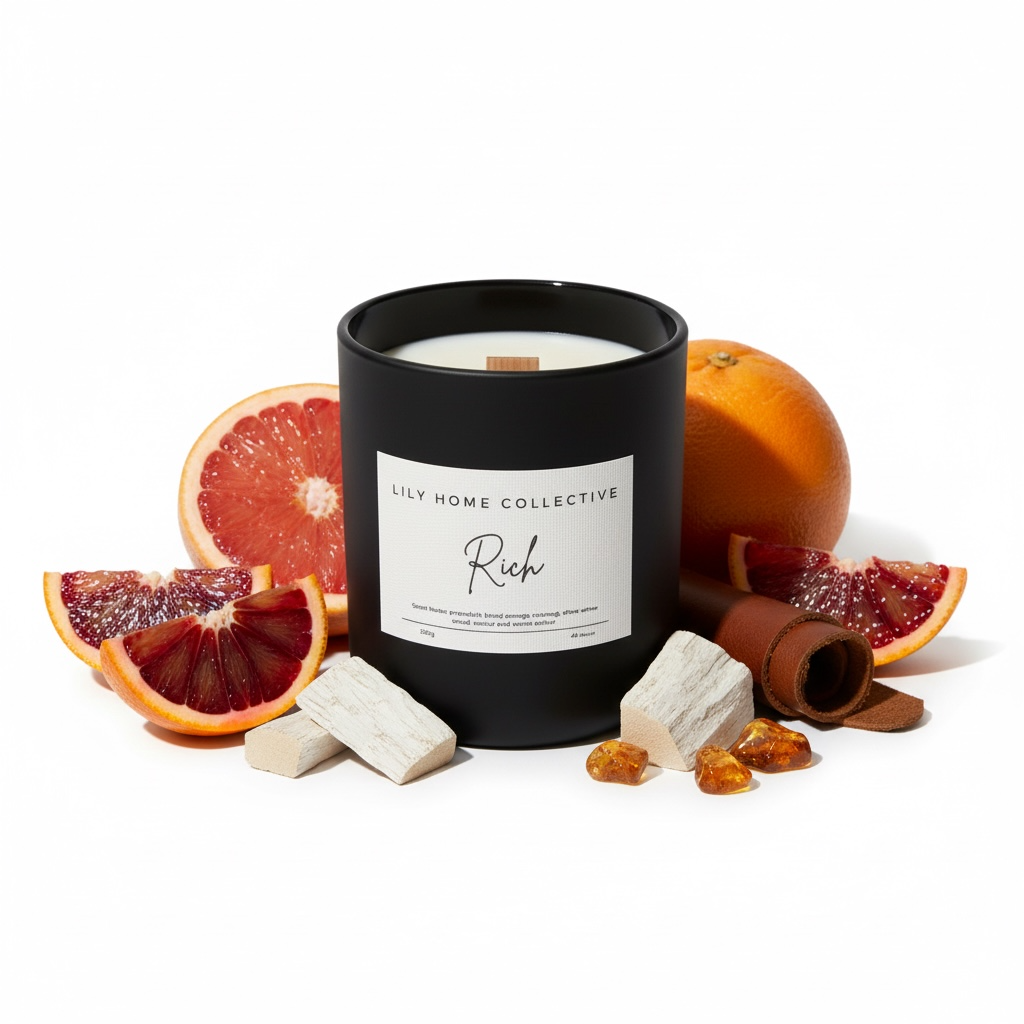 A bold and luxurious fragrance that exudes confidence. Vibrant grapefruit and orange create a zesty opening, balanced by the warm spice of nutmeg. The scent deepens into a refined base of leather, leaving a lingering impression of strength and sophistication. A statement candle for those who embrace luxury in every detail.